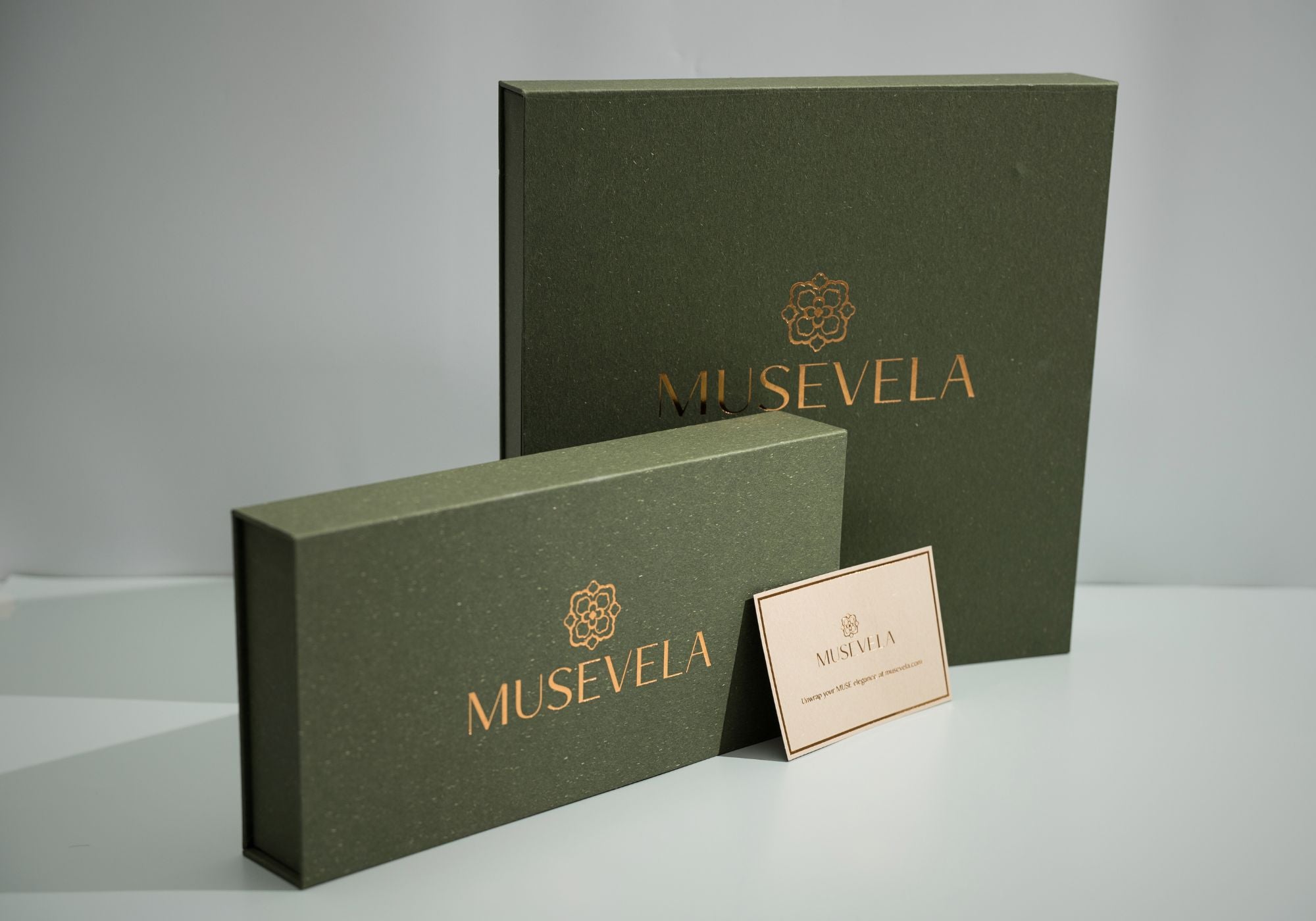 Each MUSEVELA product comes in an eco-friendly gift box made from Kazan paper, using 40% grass fiber to reduce CO2 emissions—luxury with a lighter footprint.